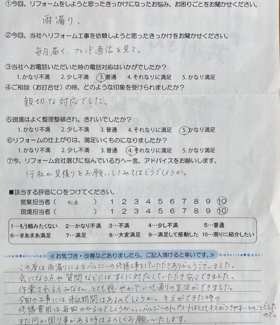 周南市のリフォーム専門店、共創リフォームです。S様、この度は雨漏り工事のご依頼を頂き誠にありがとうございました。この度は、雨漏りによるバルコニーの修繕工事をご依頼いただき、重ねてお礼申し上げます。また、毎月お届けしております「フレンド通信」がご依頼のきっかけになったとのこと、大変光栄に存じます。「親切な対応」や「作業される方みなさん、とても穏やかでいつも通りの生活が出来た」とのお褒めの言葉をいただき、スタッフ一同、今後の励みとさせていただきます。ご質問や気になる点にすぐにご対応できたことでお客様にご安心いただけたこと、何よりでございます。さて、保証期間の件ですが、通常施工保証をついております。詳しいことはわかりかねます。申し訳ございません。改めて担当の者がご連絡すると思いますので、今しばらくお時間をください。
