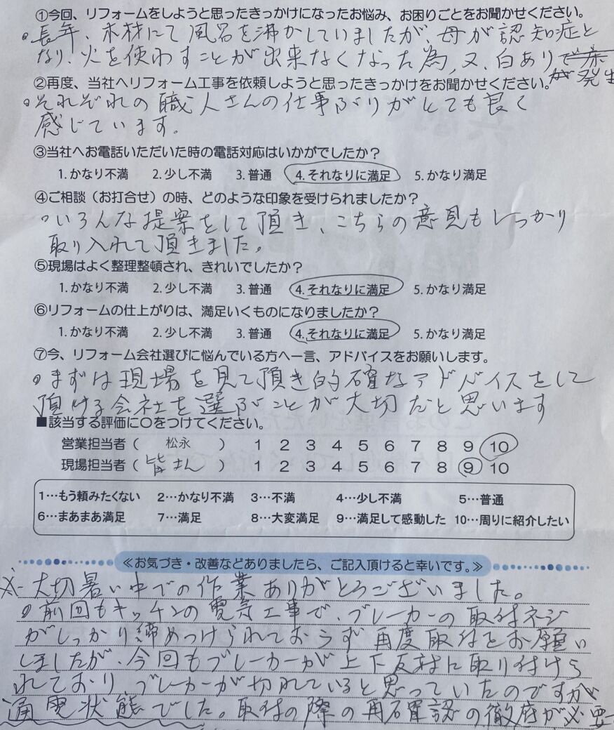 ・長年、木材にて風呂を沸かしていましたが、母が認知症となり、火を使わすことが出来なくなった為、又白あり発生。