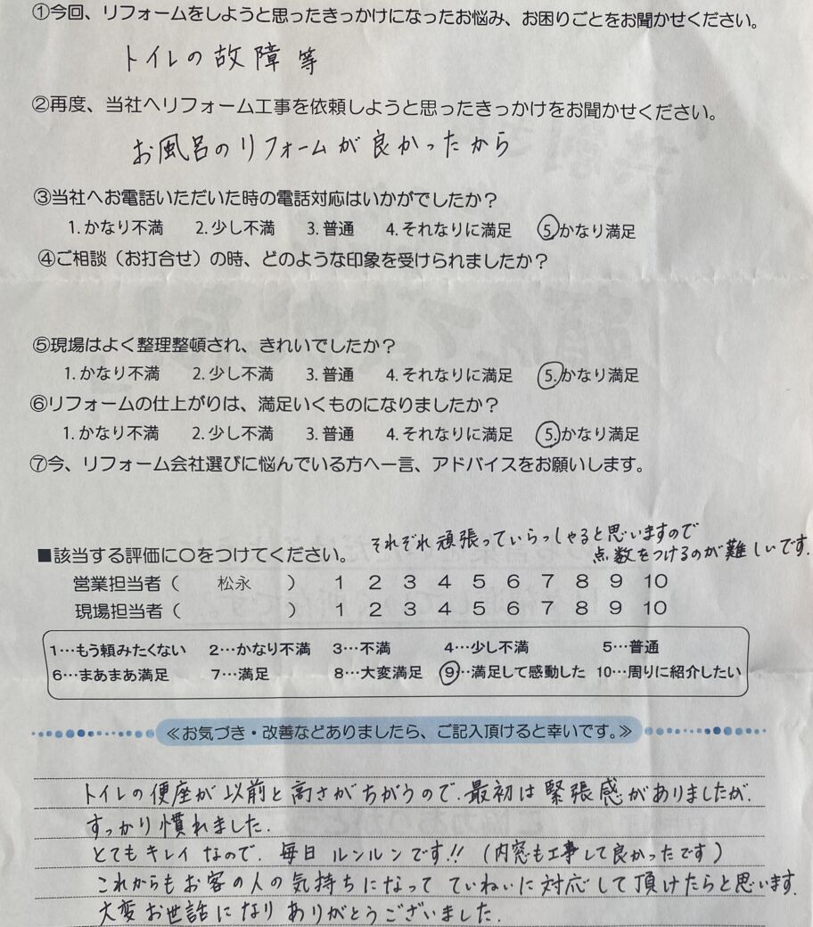 周南市のリフォーム専門店、共創リフォームです。S様、いつも共創リフォームをご利用頂き誠にありがとうございます。またこの度はトイレ交換のご依頼を頂きありがとうございました。「素敵なアンケートをいただき、本当にありがとうございます!お客様から『毎日ルンルンです!!』というお言葉をいただき、私たちも本当に嬉しくて、思わず笑顔になりました。便座の高さが以前と違って、最初はご心配をおかけしてしまったかと思いますが、今ではすっかり慣れていただけたとのこと、安心しました。内窓の工事もご満足いただけて良かったです。『これからも、お客の人の気持ちになって』というお言葉、心に響きました。このお言葉を大切に、これからも一人ひとりのお客様に寄り添った対応を心がけてまいります。この度は、本当にありがとうございました。
