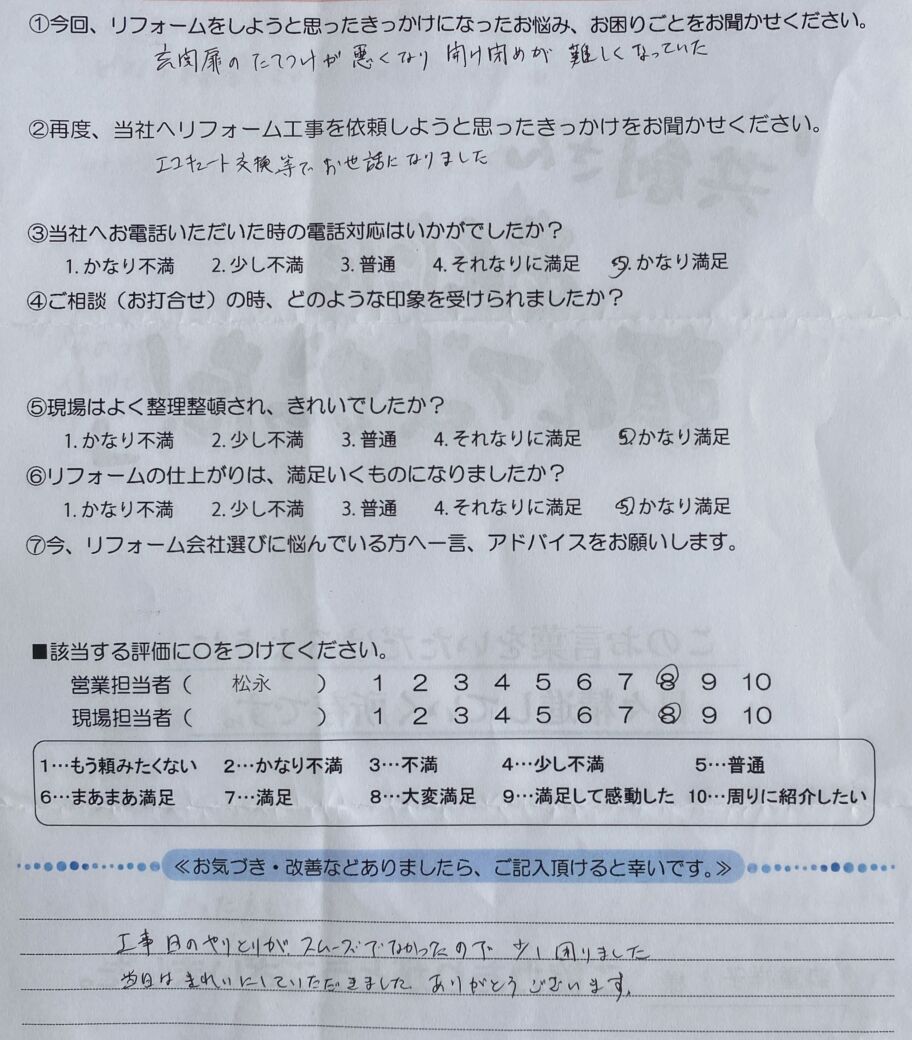 周南市のリフォーム専門店、共創リフォームです。M様、いつも共創をご利用いただきありがとうござます。また、この度は玄関サッシ交換工事のご依頼を頂き誠にありがとうございました。貴重なご意見をいただき、誠にありがとうございます。工事の仕上がりについて「きれいにしてもらいました」とのお言葉をいただき、大変嬉しく思っております。しかしながら、工事担当とのやりとりでご不便をおかけしたとのこと、深く反省しております。誠に申し訳ございませんでした。お客様に安心して工事をお任せいただけるよう、担当者間の連携を強化し、スムーズなやりとりを心がけてまいります。この度は、大変貴重なご意見をいただき、ありがとうございました。今後とも、どうぞよろしくお願い申し上げます。