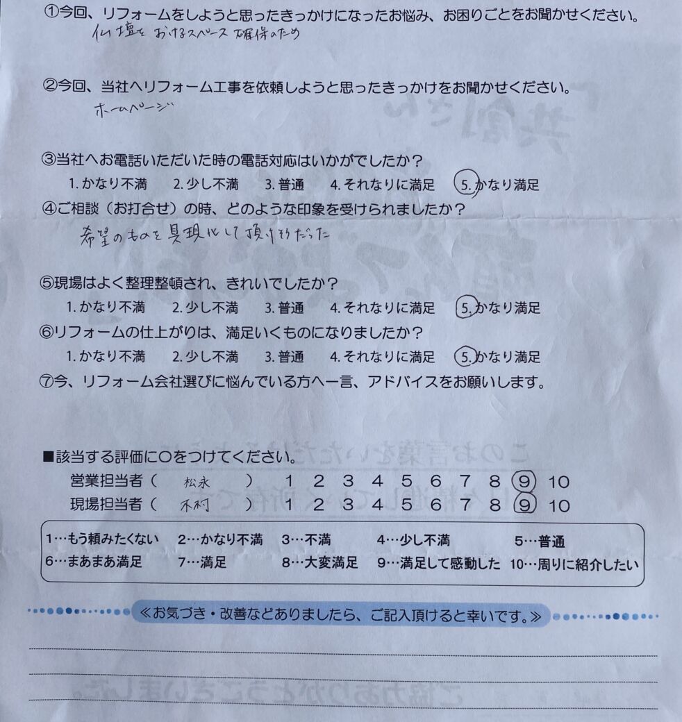 周南市のリフォーム専門店、共創リフォームです。F様、この度は床の間改修工事のご依頼を頂き誠にありがとうございました。仏壇を置くスペースの確保という、大切なご要望をお聞かせいただき、感謝申し上げます。また、お打ち合わせの際に『希望のものを具現化して頂けそうだった』というお言葉をいただき、大変嬉しく、今後の励みになります。工事後、新しいスペースにご満足いただけていることを心より願っております。これからも、お客様お一人おひとりのご要望に寄り添い、形にできるよう精進してまいります。今度ともよろしくお願いいたします。