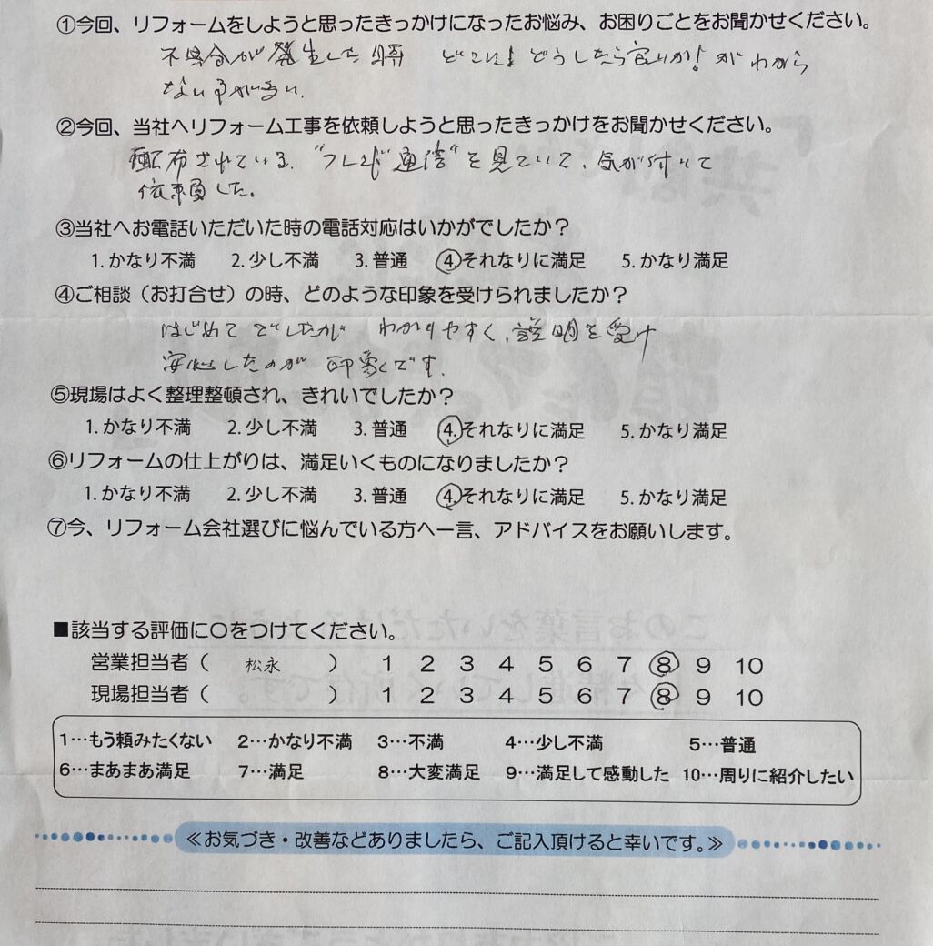 周南市のリフォーム専門店、共創リフォームです。I様、この度は水漏れ処理工事をご依頼を頂き誠にありがとうございました。「不具合が発生した時、どこに!どうしたら良いか!」わかります!不安になりますよね。フレンド通信をご覧いただけてご連絡を頂けたとの事で、とても嬉しく拝見させていただきました。「はじめてでしたが、わかりやすい説明を受け安心してのが印象です」また嬉しい感想をいただき担当者も大変喜んでおります。又お困りごとなどございましたら、お気軽にご連絡いただければと思います。今後も共創リフォームをよろしくお願い致します。