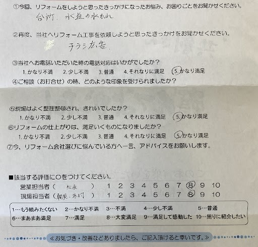 周南市のリフォーム専門店、共創リフォームです。T様、この度はキッチン水栓取替・修繕工事のご依頼を頂き誠にありがとうございます。台所の水道の水漏れという緊急性の高いお困りごとが、今回のリフォームをご検討される直接的なきっかけとなったと理解いたしました。水回りのトラブルは、日々の生活に大きな影響を及ぼすかと存じます。また、数あるリフォーム会社の中から、当社のチラシ広告をご覧になり、再度ご依頼をご検討いただけたこと、大変光栄に思います。何かお気づきの点や新たなお困りごとがございましたら、いつでもお気軽にご相談ください。