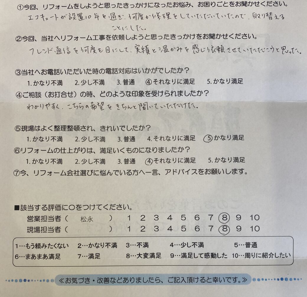 周南市のリフォーム専門店、共創リフォームです。T様、この度はエコキュート交換工事のご依頼を頂き誠にありがとうございます。エコキュートの設置から10年が経過し、修理を重ねてこられた中での交換リフォームを、当社にご用命いただき重ねて感謝申し上げます。また、「フレンド通信」を通じて当社の実績と温かみを感じていただき、ご依頼のきっかけになったと伺い、大変嬉しく思います。お客様との繋がりを大切にする当社の思いが伝わったこと、何よりの喜びです。ご相談時には、お客様のご希望をきちんと丁寧にお伺いすることを心がけております。「わかりやすく、希望を聞いてもらえた」とのお言葉をいただき、今後の励みになります。何かお困りのことがございましたら、お気軽にご相談ください。
