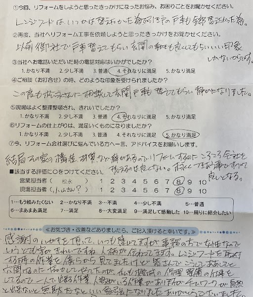 周南市のリフォーム専門店、共創リフォームです。I様、この度はレンジフード交換・引き戸戸車交換工事のご依頼を頂き誠にありがとうございます。今回も弊社のリフォームサービスをご利用いただき、重ねて御礼申し上げます。長年懸案だったレンジフードの交換と、日々お使いになる引き戸の戸車交換という、暮らしを快適にするための重要なリフォームをお手伝いできたこと、大変嬉しく思っております。前回に引き続き弊社をお選びいただけたのは、「以前の工事で良い印象を持っていただけた」という、お客様のお言葉が全てです。私たちにとって何よりの喜びであり、今後の励みとなります。また、「末永くつきあう事ですべて良しとなる」という、リフォーム会社選びに関する深いアドバイスは、まさに私たちが目指す地域密着で信頼されるリフォーム店の姿を体現されており、大変感銘を受けました。このお言葉を胸に、今後もお客様の住まいの「かかりつけ医」としてあり続けたいと改めて決意いたしました。今後もお客様に快適に、そして安心してお過ごしいただけるよう、今回のご意見を全社員で共有し、より一層のサービス向上に努めてまいります。些細なことでも、住まいに関するお困りごとや気になる点がございましたら、いつでもお気軽にご相談ください。今後とも末永いお付き合いを、どうぞよろしくお願い申し上げます。