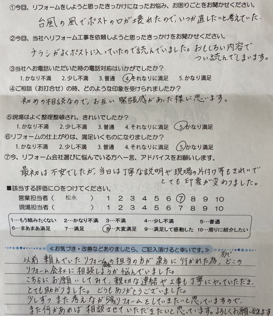 周南市のリフォーム専門店、共創リフォームです。M様、この度はポスト交換工事のご依頼を頂き誠にありがとうございます。以前頼まれていた業者様が遠方へ行かれたとのことで、新たな依頼先を探すのにはご不安もおありだったかと思います。その中で、当社のチラシをきっかけにお声がけいただけたこと、大変光栄に思います。「つい読んでしまう」とのお言葉、チラシ作成の励みになります。初回の打ち合わせ以降ご不安と緊張感をお持ちいただいておりましたが、工事の仕上がりや現場の片付けについて「印象が変わった」とのお言葉をいただき、ホッと胸をなでおろしております。「少しずつ家とリフォームをしていきたい」とのこと、素敵なお考えですね。お家のことで何か気になった際は、いつでもお気軽にご相談ください。 今後とも末永いお付き合いをよろしくお願い申し上げます。
