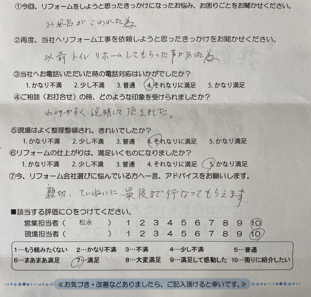 周南市のリフォーム専門店、共創リフォームです。A様、この度はエコキュート設置工事のご依頼を頂き誠にありがとうございます。「お風呂が壊れてしまった」という緊急性の高い状況でのご依頼でしたが、迅速かつ丁寧にご対応できたとのこと、安堵いたしました。特に、「以前トイレリフォームをしてもらったので」と、前回の工事にご満足いただき、今回も弊社にご依頼いただけたことが私たちにとって何よりの励みとなります。お客様との信頼関係を大切にしてきた努力が実を結んだと実感しております。また、ご相談時には「わかりやすく説明してもらえた」とのお言葉、そして「親切、ていねいに最後まで行ってもらえます」とのお墨付きまでいただき、スタッフ一同大変光栄に思っております。今後も、お客様にご安心いただき、ご満足いただけるサービスをご提供できるよう、より一層精進してまいります。
