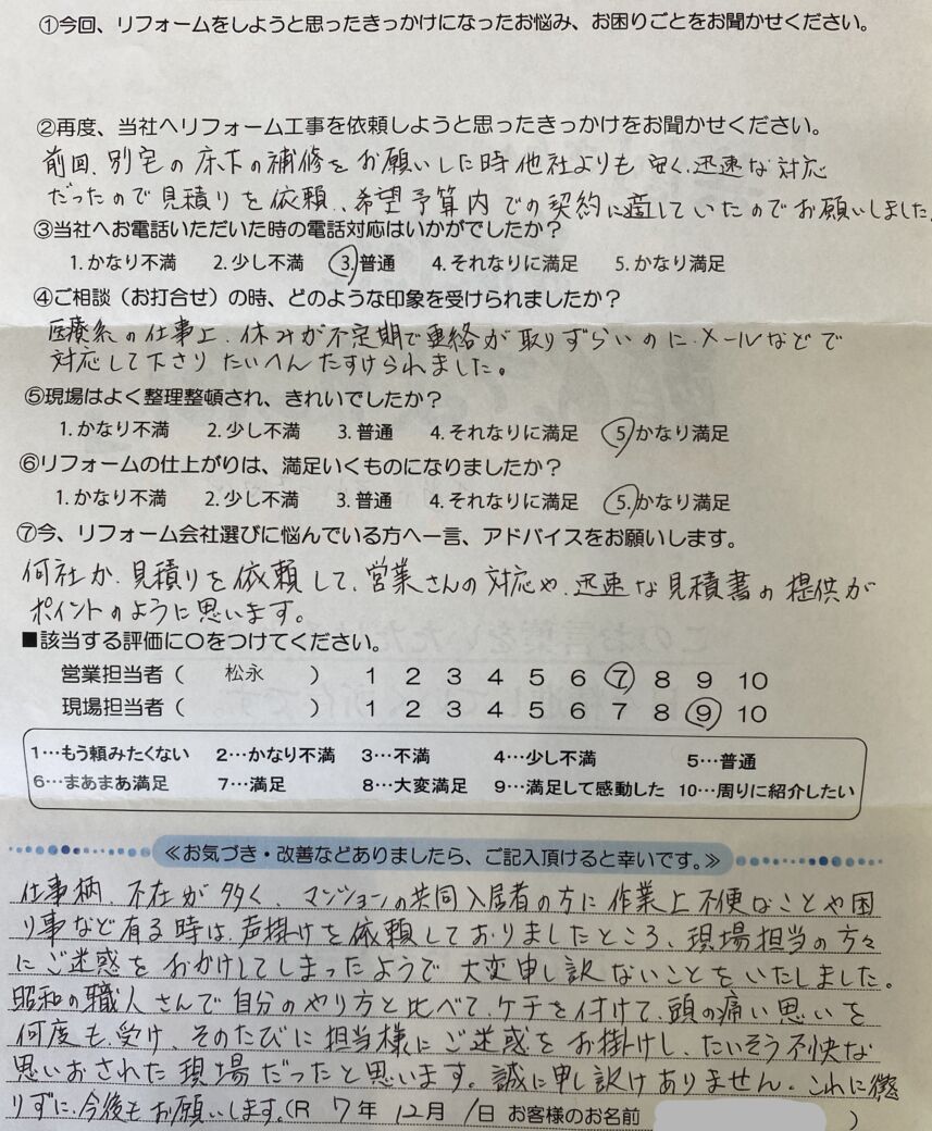仕事柄不在が多く、マンションの共同入居者の方に作業上不便なことや困り事など有る時は声掛けを依頼しておりましたところ、現場担当の方々にご迷惑をおかけしてしまったようで大変申し訳ないことをいたしました。昭和の職人さんで自分のやり方と比べてケチを付けて頭の痛い思いを何度も受け、そのたびに担当様にご迷惑をお掛けし、たいそう不快な思いおされた現場だったと思います。誠に申し訳ありません。これに懲りずに今後ともお願いします。