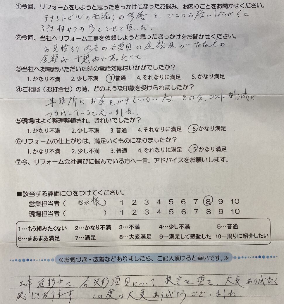 テナントビルの雨漏りの修繕をどこにお願いしようか?と3社相みつの形とさせて頂いた。