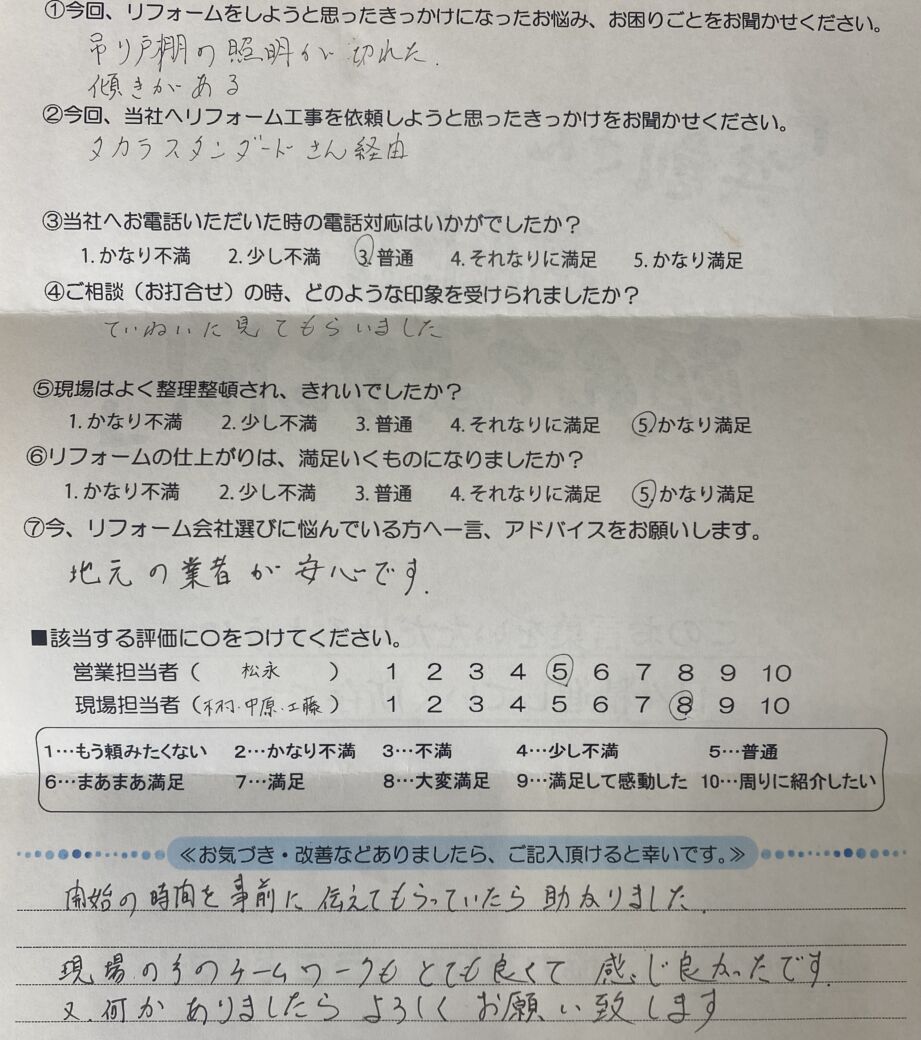 周南市のリフォーム専門店、共創リフォームです。Y様、この度は電動吊戸棚設置工事のご依頼を頂き誠にありがとうございます。「地元の業者が安心」とのお言葉をいただき、地域に根ざした活動を大切にしている私共にとって、これ以上ない励みとなりました。現場スタッフのチームワークについても評価していただき、担当した者も大変喜んでおります。施工開始時間のご連絡については、配慮が至らずご不便をおかけし、誠に申し訳ございませんでした。いただいたご指摘を社内で共有し、今後は事前のご連絡を徹底し、よりスムーズに工事をお任せいただけるよう努めてまいります。またお住まいのことでお困りごとがございましたら、いつでもお気軽にご相談ください。今後とも末永いお付き合いをよろしくお願い申し上げます。