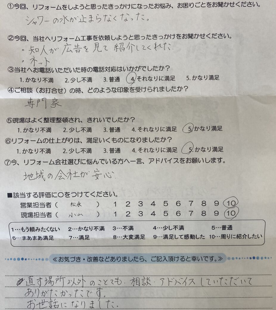 お客様の声 浴室水栓取替工事 周南市。