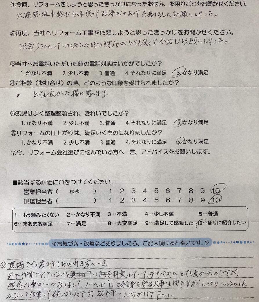 太陽熱温水器も35年使って限界があって共創さんにお願いしました。