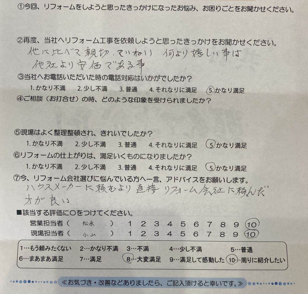 周南市のリフォーム専門店、共創リフォームです。U様、この度はガス給湯器取替工事のご依頼を頂き誠にありがとうございます。「他社に比べて親切、丁寧」とのお言葉をいただき、担当したスタッフ一同、大変喜んでおります。何より価格面でもご満足いただけたことは、自社施工(直接依頼)の強みを大切にしている弊社として、大きな励みになります。「ハウスメーカーよりも直接リフォーム会社へ」という、これから検討される方への力強いアドバイスもありがとうございます。今後もお住まいのことで何かお困りごとがございましたら、いつでもお気軽にご相談ください。末永いお付き合いのほど、よろしくお願い申し上げます。