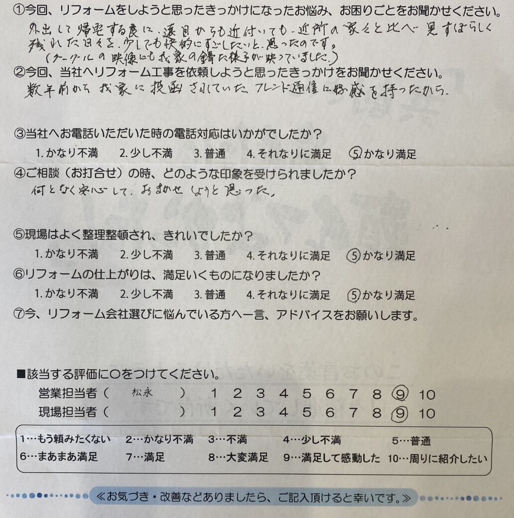 周南市のリフォーム専門店、共創リフォームです。K様、この度は外壁塗装工事のご依頼を頂き誠にありがとうございます。日々のもやもやとした気持ちへの解消のお手伝いができましたでしょうか。数年前からお届けしていた弊社のフレンド通信を、ずっと大切に読んでくださっていたのですね。「好感を持った」というお言葉は、私たちにとって何よりの励みになります。コツコツと続けてきた発信が、お客様の安心の種になっていたことを知り、スタッフ一同大変感激しております。何かお気づきの点や、住まいに関するお困りごとがございましたら、お気軽にご相談ください。今後とも末永いお付き合いをいただけますよう、よろしくお願い申し上げます。