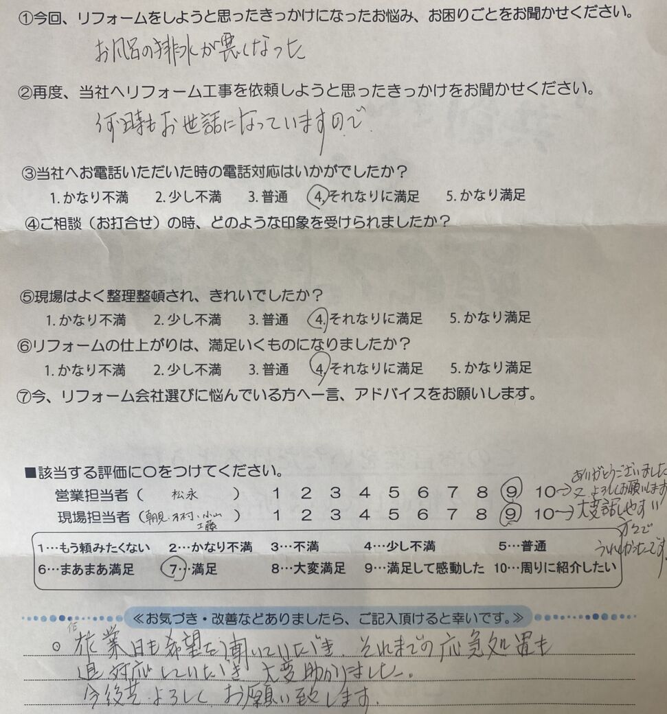 周南市のリフォーム専門店、共創リフォームです。M様、この度はユニットバス・屋根工事のご依頼を頂き誠にありがとうございます。今回、お風呂の排水不良というお困りごとをきっかけにご相談いただき、また日頃より当社をご利用いただいている中で再度ご依頼いただきましたこと、心より感謝申し上げます。また、営業担当並びに弊社職人への温かいお言葉をいただきましてありがとうございます。作業日程のご希望やそれまでの応急処置につきましてもお役に立てたとのお言葉をいただき、大変嬉しく思っております。今後も迅速かつ丁寧な対応を心掛け、よりご満足いただけるサービスを提供してまいります。今後とも末永いお付き合いのほど、よろしくお願い申し上げます。